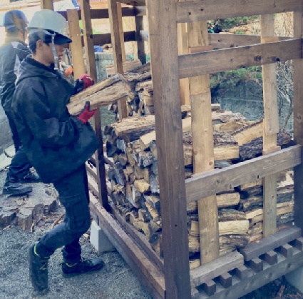 ・ハッキピルケ(大型薪割り機)を使って数人のチームで薪割り